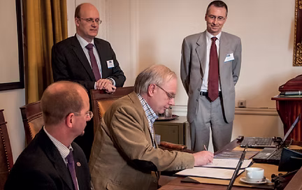 December 10, 2024: Geological Society of America President Chuck Bailey signs Memorandum of Understanding with ProGEO at the Cosmos Club in Washington, D.C. Left to right, Priscilla Grew, ProGEO VP North America; GSA President Chuck Bailey; Drew Andrews, Kentucky Geological Survey; Ester Sztein, GSA Director of International Programs.