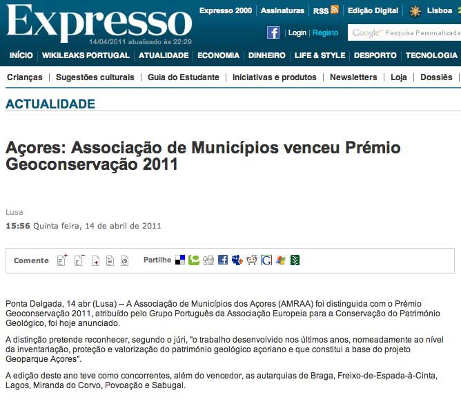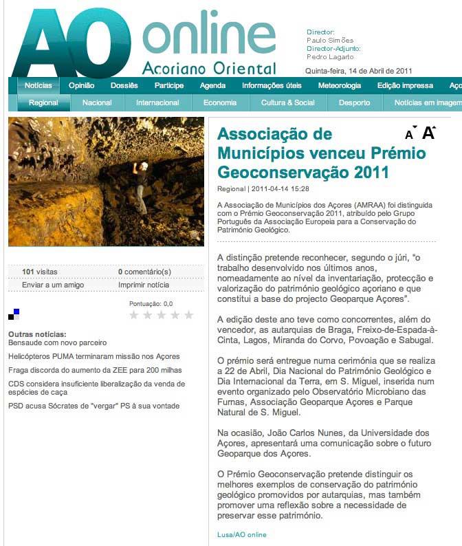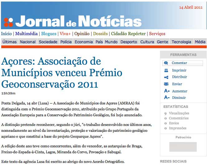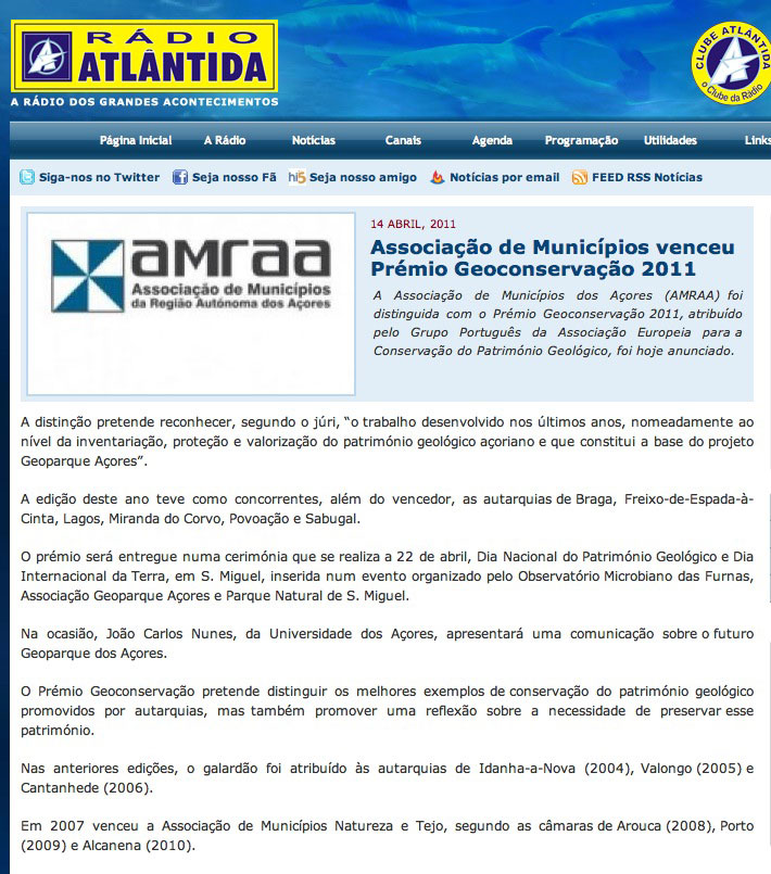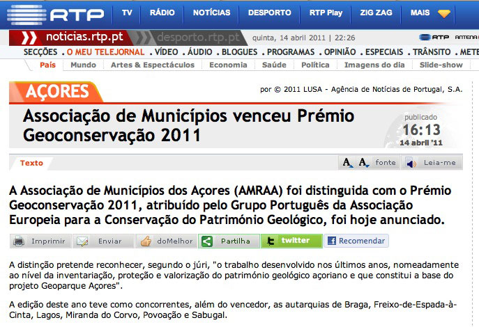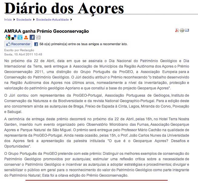 “…o Júri reconheceu o trabalho desenvolvido na Região Autónoma dos Açores nos últimos anos, nomeadamente a nível da inventariação, protecção e valorização do património geológico Açoriano e que constitui a base do projecto Geoparque Açores”
