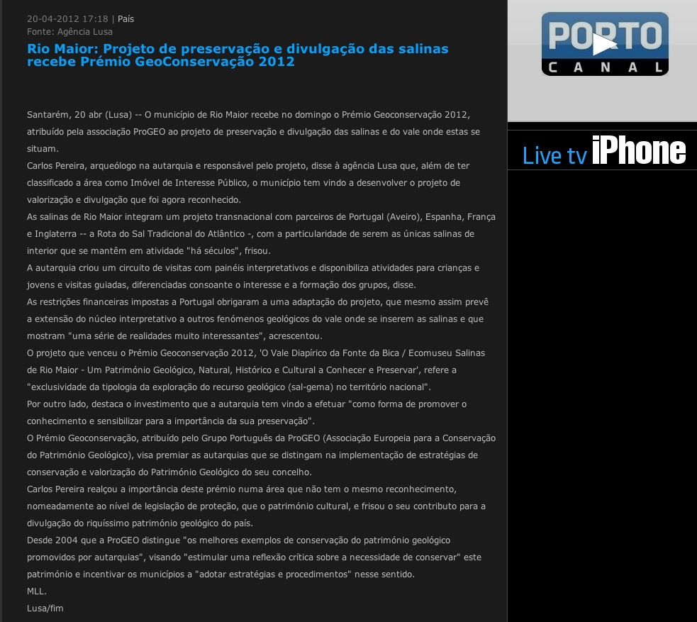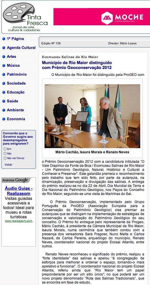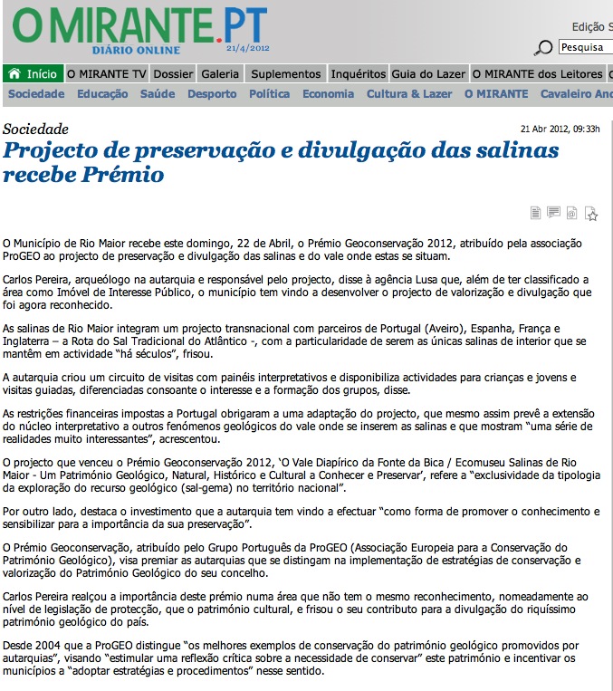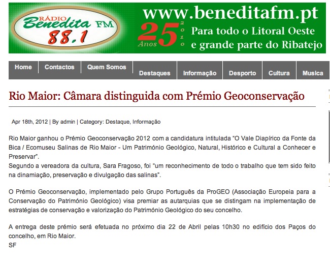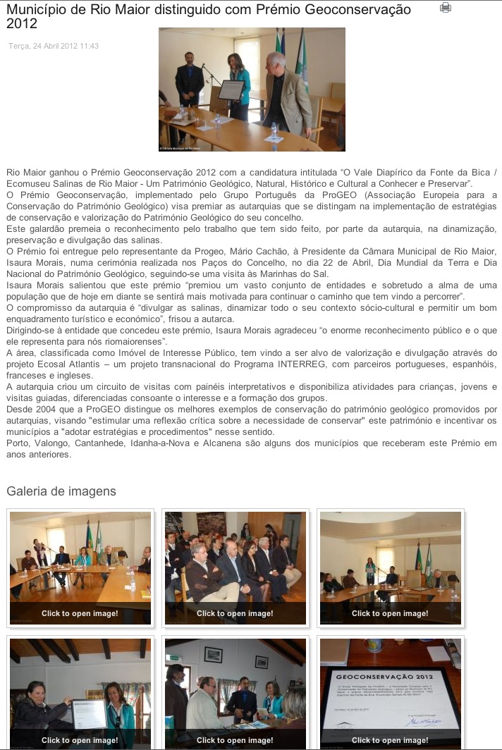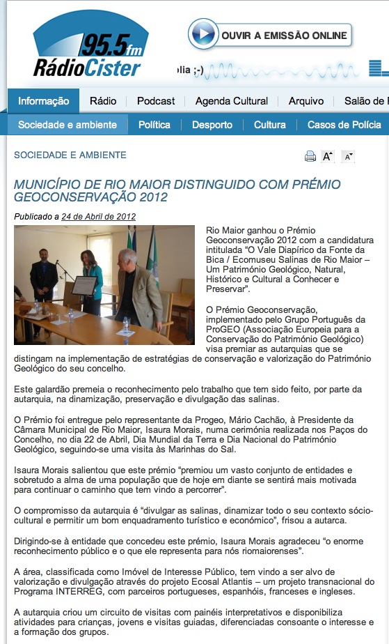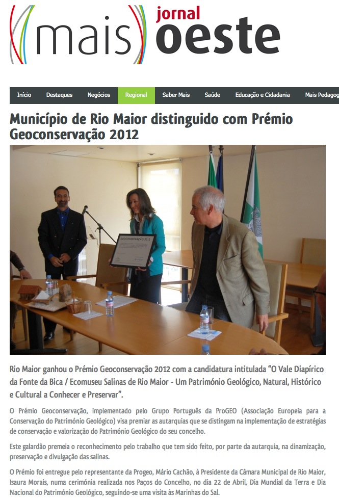 “…o Júri reconheceu o trabalho desenvolvido destacou o facto da autarquia ter classificado a área como Imóvel de Interesse Público e de ter desenvolvido um museu onde se promovem ações de carácter educativo e turístico”